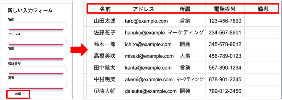 入力された内容は自動でスプレッドシートに転記されるため、手作業でまとめる必要がありません。