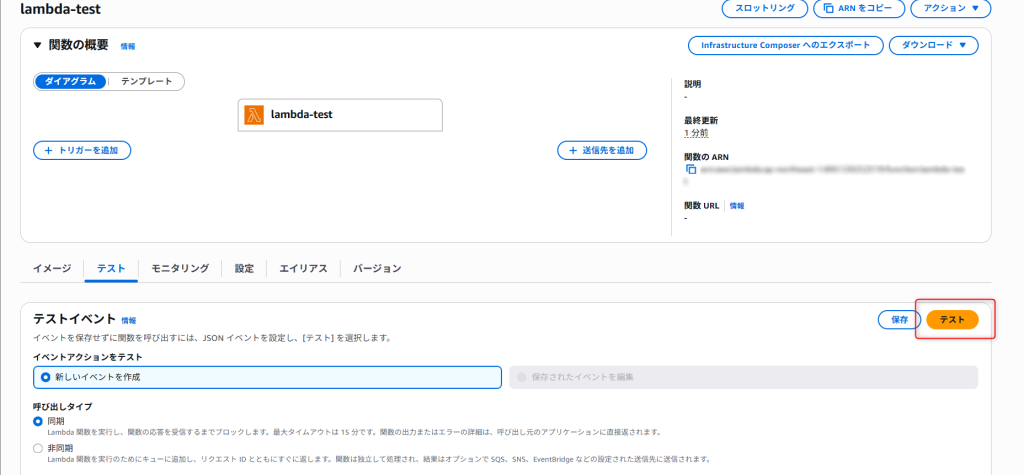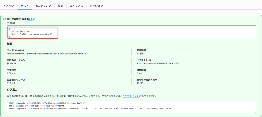 テストボタンを押すと、ステータスコード200とHello from Lambda container!が表示されました。