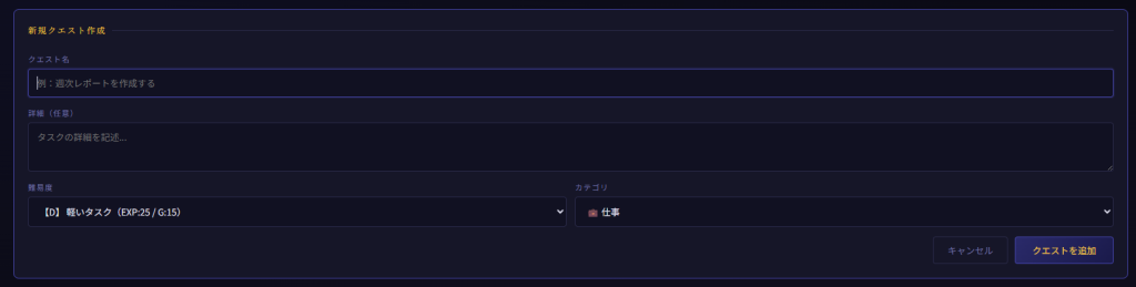 タスクにはタスク名、内容詳細(任意)、難易度、カテゴリを入力します