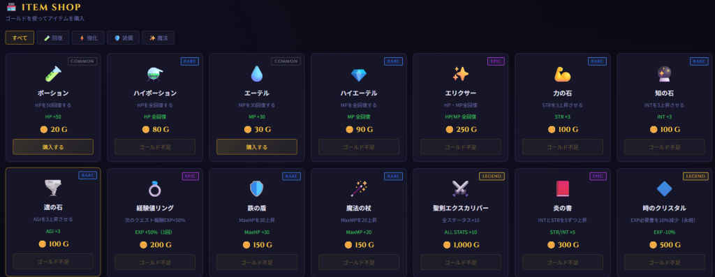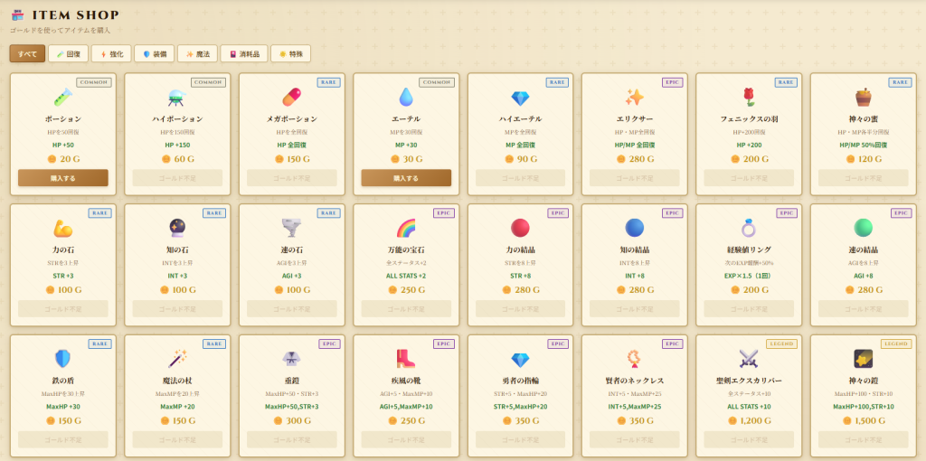 ・お金を使用してショップでアイテム購入が可能