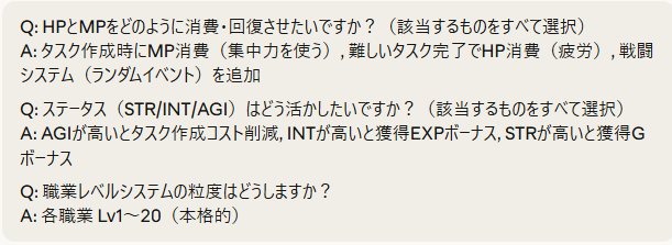 タスクを作成するのにMPを消費したり、タスク完了すると疲労でHPが減少したり、ステータス要素も追加出来ました
