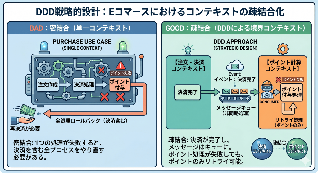 「商品を購入する」というユースケース(行動)で発生する処理を密結合にしてしまうと、決済後にユーザーにポイントを付与する処理で問題が発生した場合、ロールバックやリトライをする場合、決済等もやり直すことになってしまうといった事態になりかねないです。コンテキストを分けることでポイントを付与する処理はキューイングさせて別処理させることで疎結合にすることも可能となります。これが戦略的設計です。