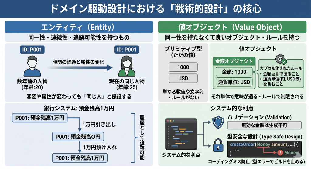 一方で、エンティティや値オブジェクトはドメイン駆動設計の中での戦術的設計に含まれる設計アプローチです。